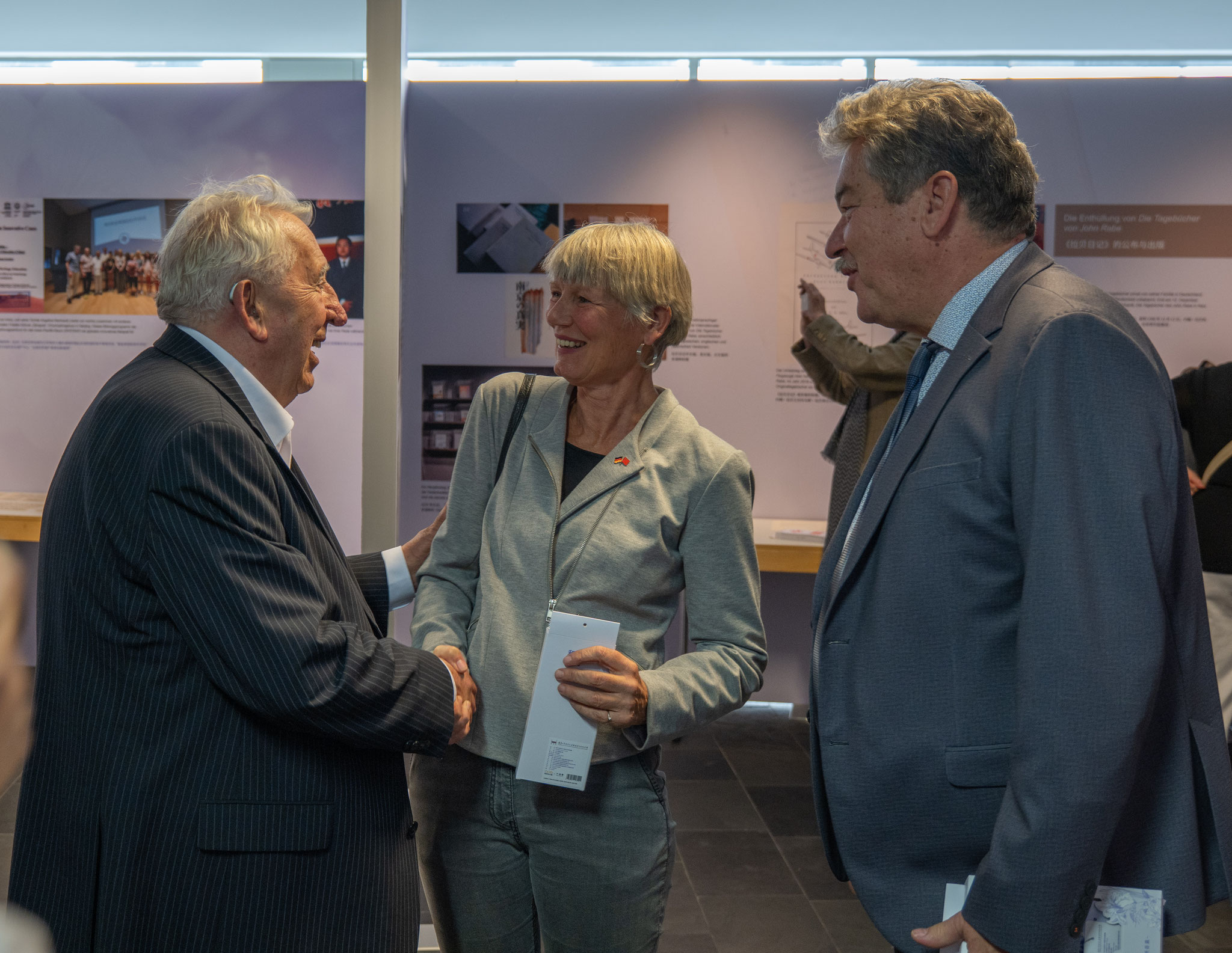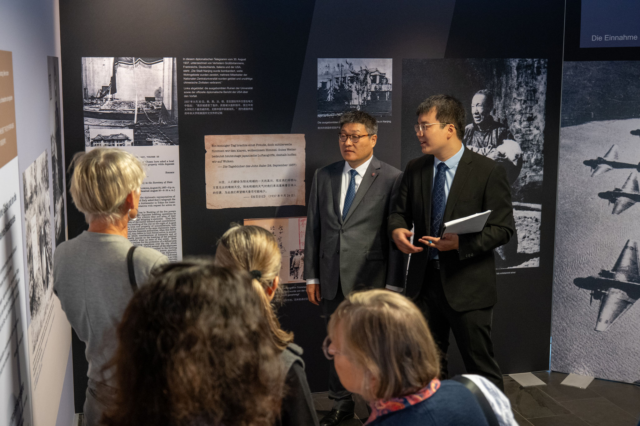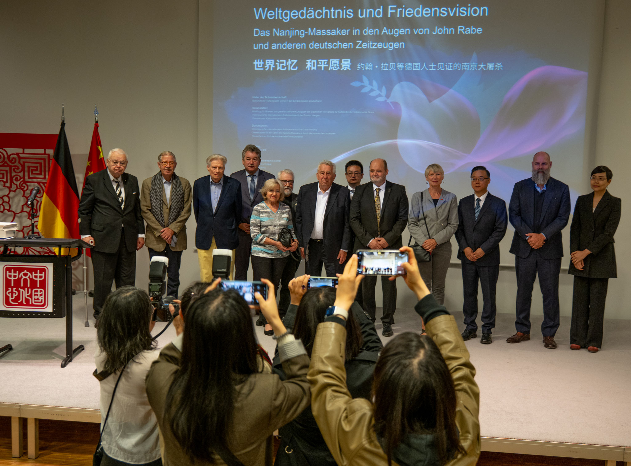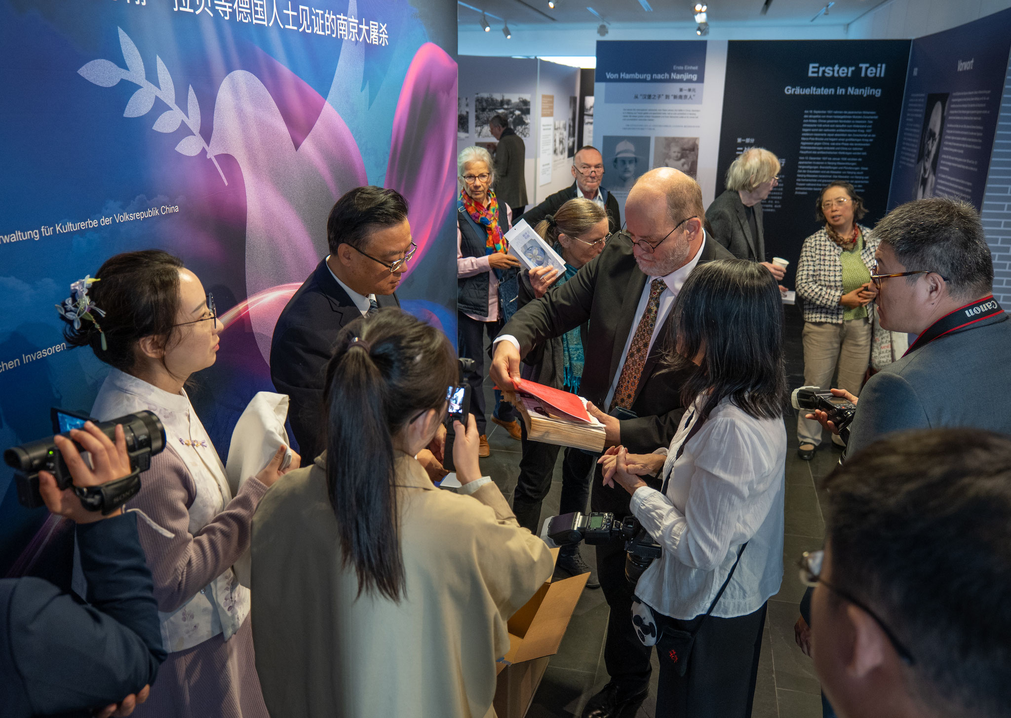 Um das Verständnis der internationalen Gemeinschaft für die historischen Tatsachen des Nanjing-Massakers zu vertiefen und die gemeinsame Idee von Frieden und Entwicklung zu vermitteln, veranstaltet das Chinesische Kulturzentrum Berlin in Zusammenarbeit mit der Gedenkstätte der Opfer des Nanjing-Massakers durch die japanische Invasionsarmee die Ausstellung „Weltgedächtnis und Friedensvision -- Das Nanjing-Massaker in den Augen von John Rabe und anderen deutschen Zeitzeugen“. Anhand historischer Dokumente, Bildmaterialien und wertvoller Exponate werden die Erfahrungen und Handlungen deutscher Zeitzeugen in Nanjing gezeigt. Die Ausstellung ruft dazu auf, die Geschichte nicht zu vergessen und den Frieden zu bewahren.